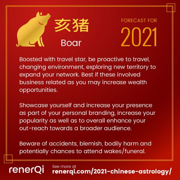 Boar zodiac forecast in 2021, discover these auspicious stars such as Sky Horse, Bright Hall, Golden Carriage supporting you and what negative stars such as Funeral Guest and Sky Dog could be affecting you indirectly.