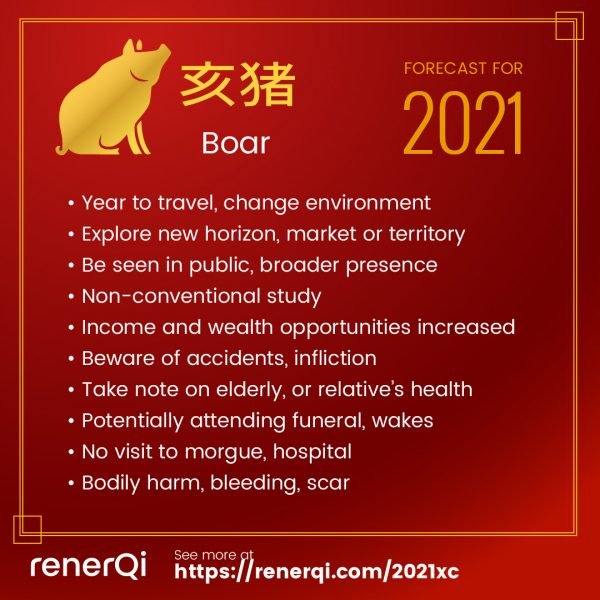 Boar animal sign could potentially appear in different pillar of your Bazi. Plot your Bazi anywhere online or directly order a Personalized Bazi Report so you could focus on your plan instead of tedious study.