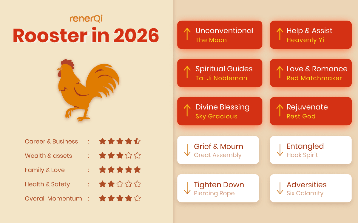 The Rooster zodiac in 2026 steps into a year of closure, healing, and upgrade. Old knots, karmic entanglements, past mistakes, and unresolved feelings start resurfacing. They are not here to punish you. They are here to be cleared. At the same time, you receive one of the strongest combinations of helpful nobleman stars together with the ultimate relationship star, giving you support, guidance, and emotional warmth to walk through this chapter with more grace.